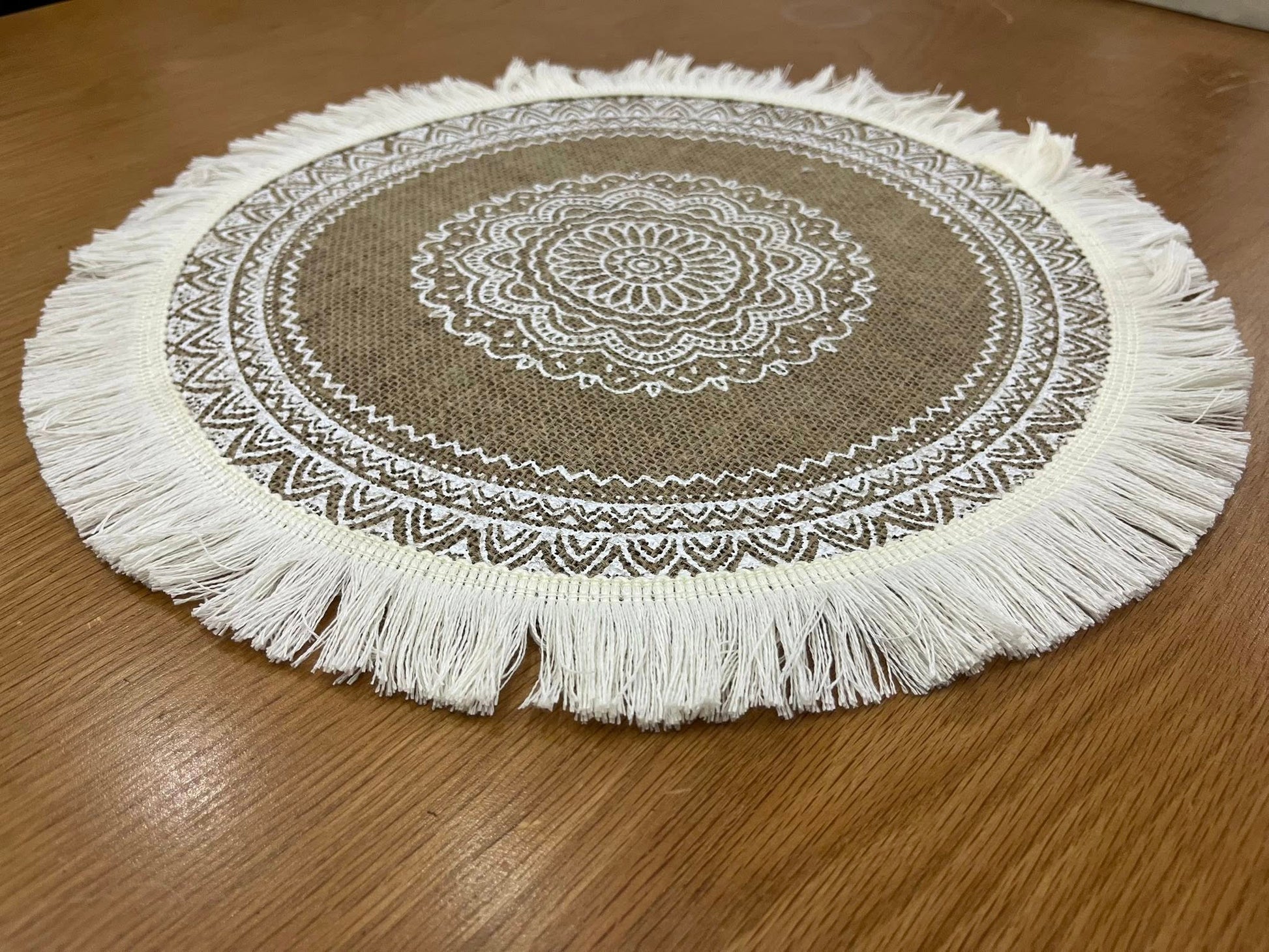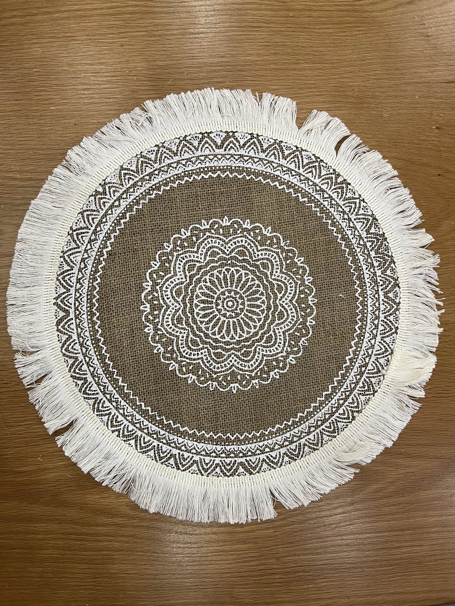أجواء ريفية مريحة ولمسة طبيعية ساحرة! كوستر دائري مصنوع من الكتان بجودة عالية، يتميز بتصميم "بوهو" (Boho) الفريد ونقوش هندسية يدوية، مما يجعله قطعة ديكور مميزة على مائدتك.