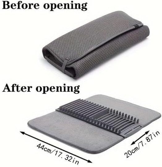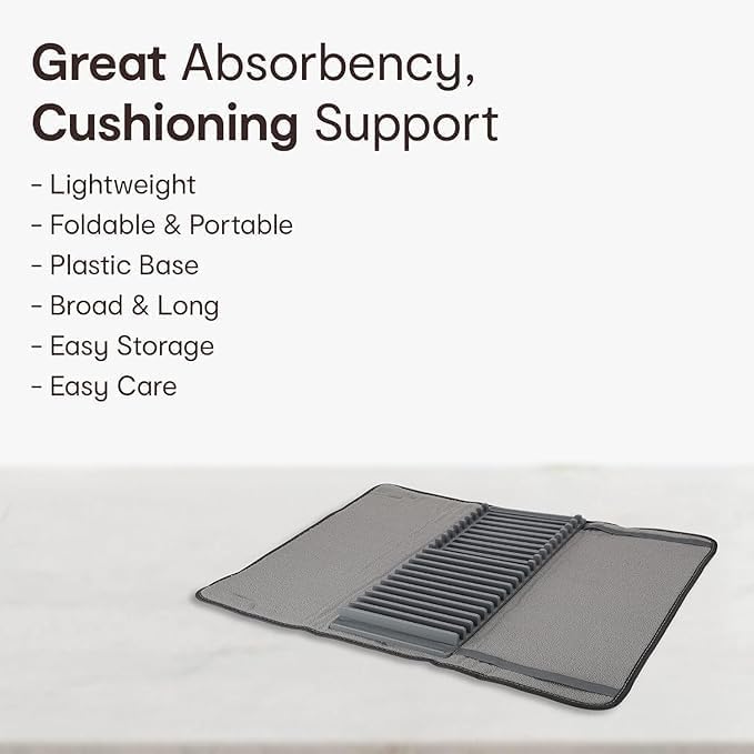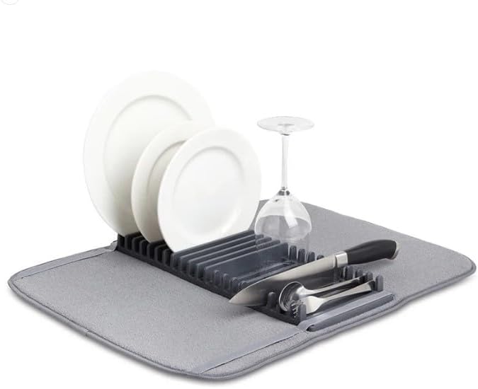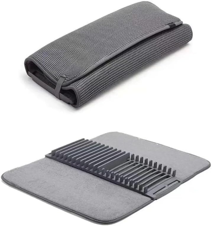 حل عملي وذكي لتجفيف وتنظيم الأطباق والأكواب على الرخامة. المصفاة دي بتيجي مدمجة مع بساط (سجادة) من قماش المايكروفايبر عالي الامتصاص، وده بيساعد الأطباق تنشف بسرعة أكتر وبيحافظ على رخامة المطبخ جافة ونظيفة. بتوفر مساحة وبتتخزن بسهولة.