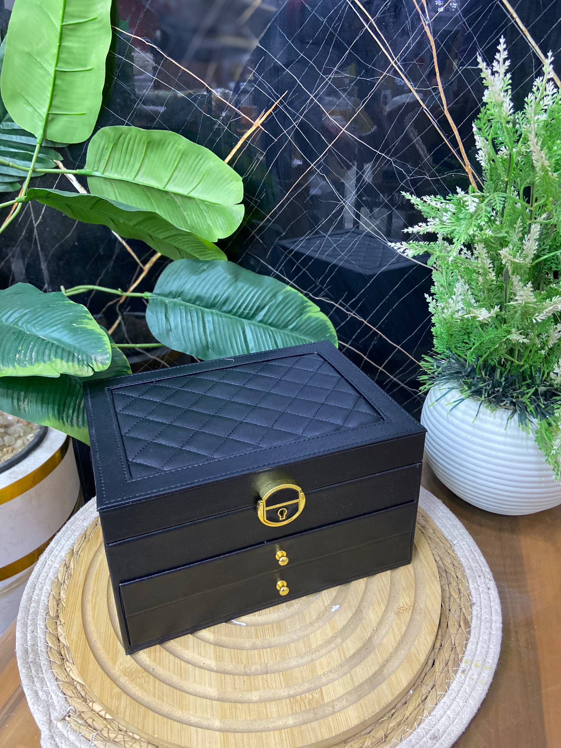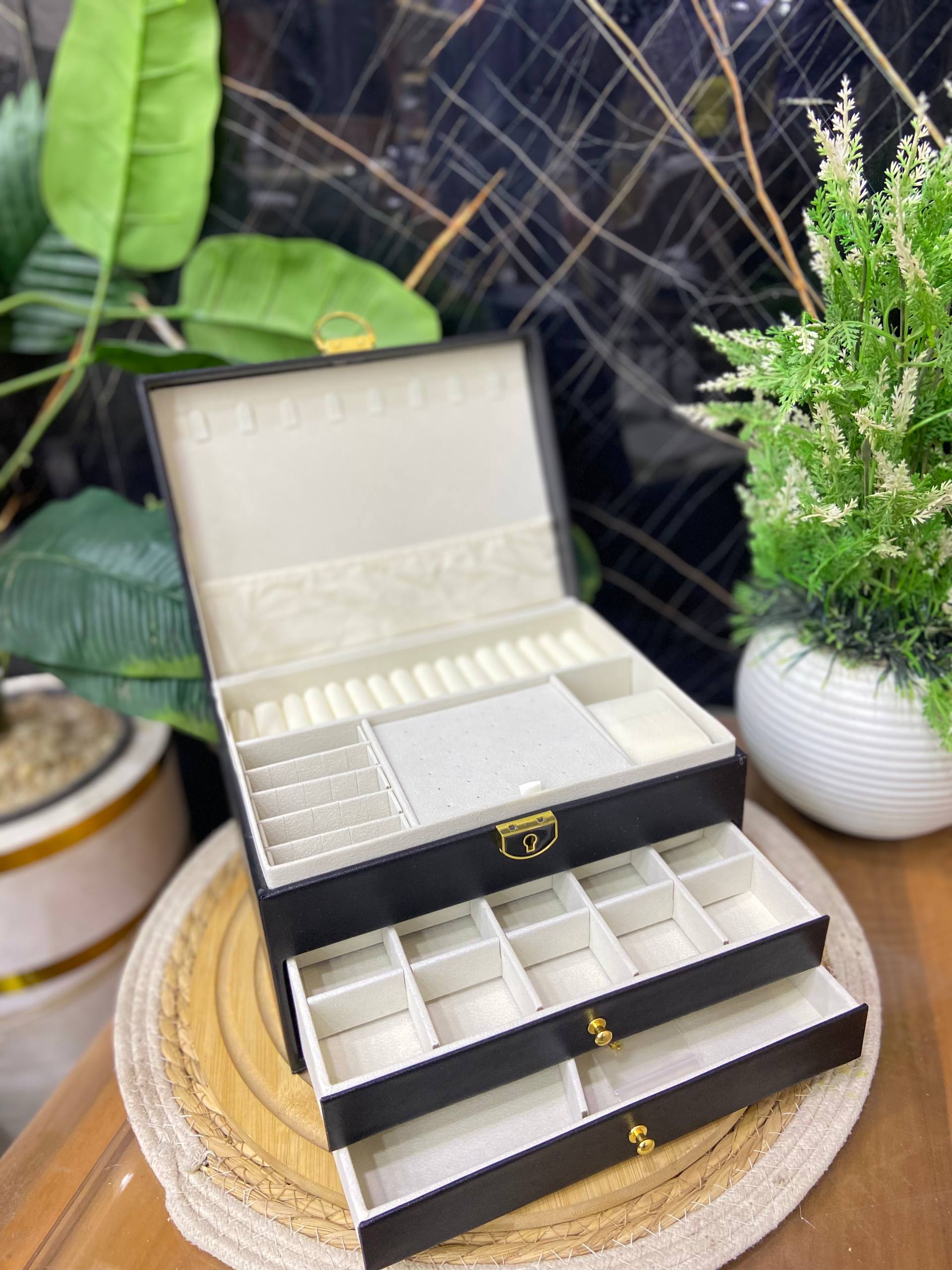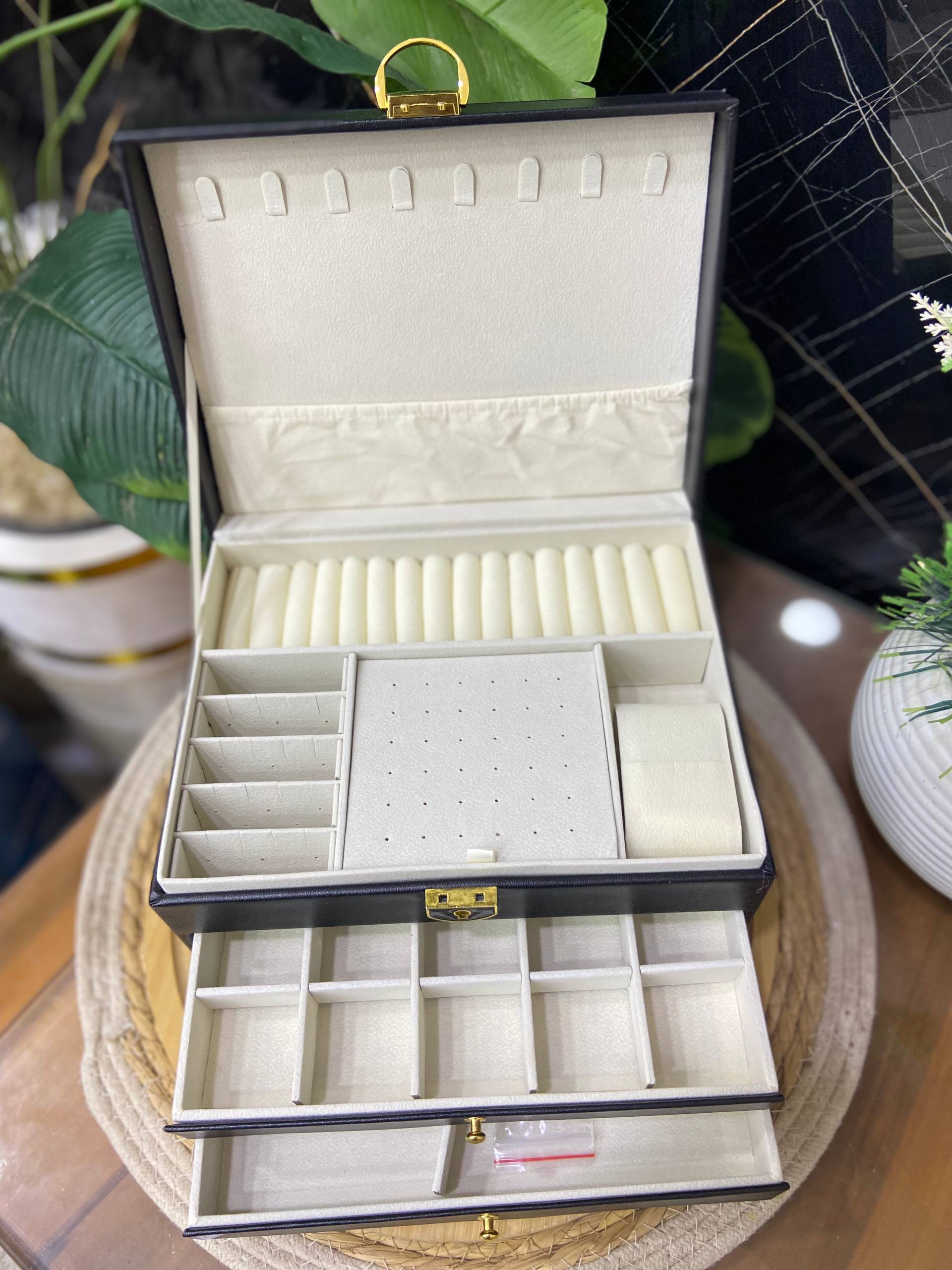 تنظيم شامل وحماية أنيقة لمجوهراتك! صندوق تخزين وتنظيم فاخر للإكسسوارات، مصنوع من الجلد الخارجي المتين، ومقسم من الداخل لعدة مستويات، ويحتوي على قفل لضمان أمان محتوياته.