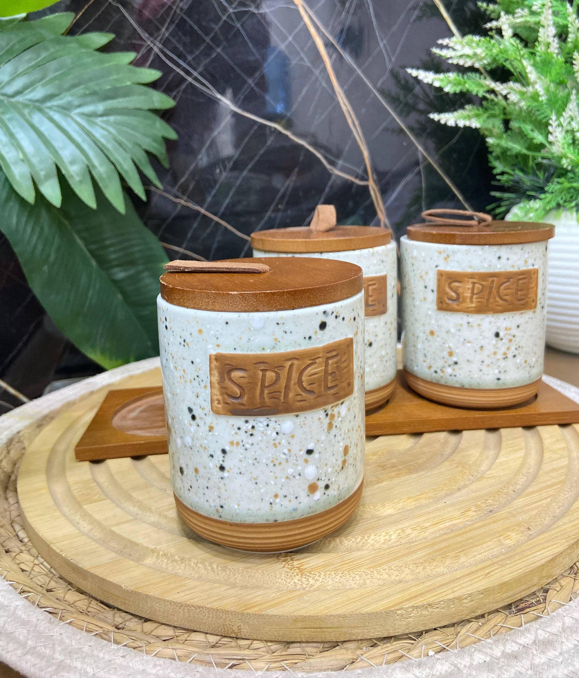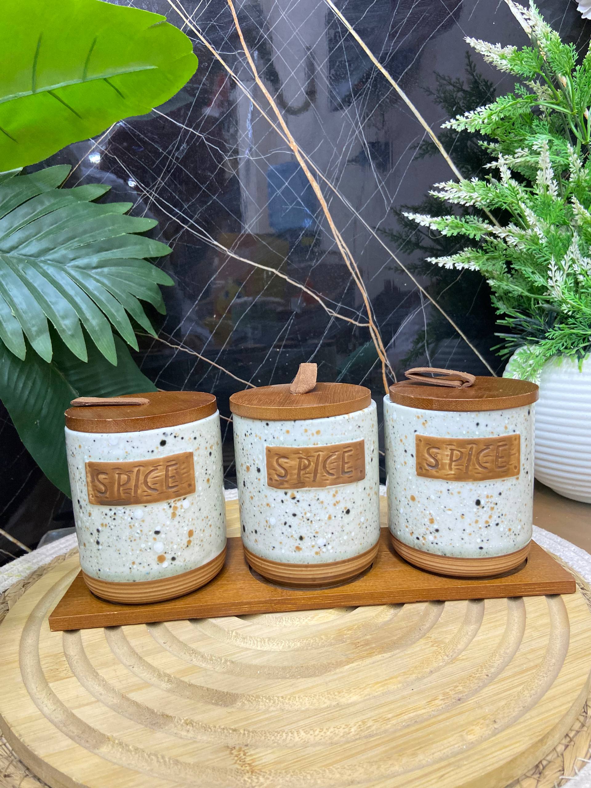 أناقة الطبيعة في مطبخك... لمسة ريفية عصرية! طقم توابل بورسلين شيك جداً مكون من 3 قطع، يتميز بتصميمه الفريد الذي يجمع بين جودة البورسلين ودفء الخشب البني، وهو مثالي لتنظيم المونة الأساسية.