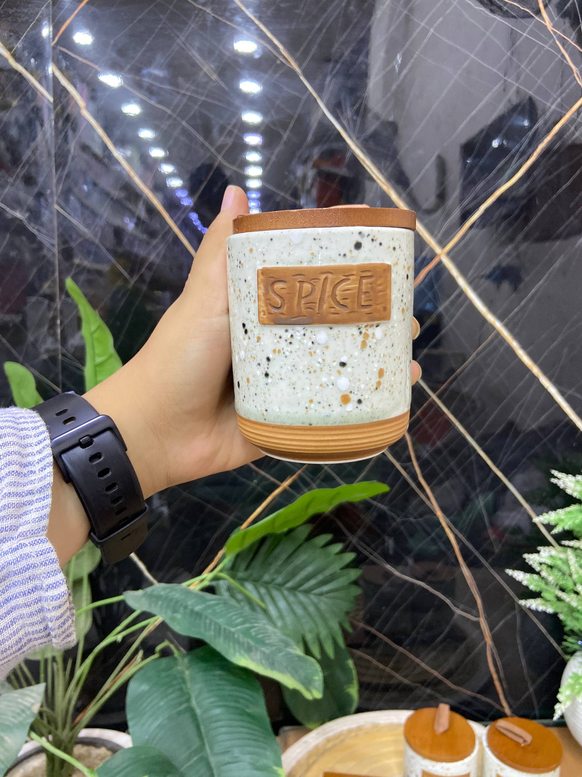 - الخامة والتصميم: مصنوع من البورسلين بتصميم مميز بنقاط (Speckled finish)، ومزين بملصق بارز يحمل كلمة "SPICE" (توابل).