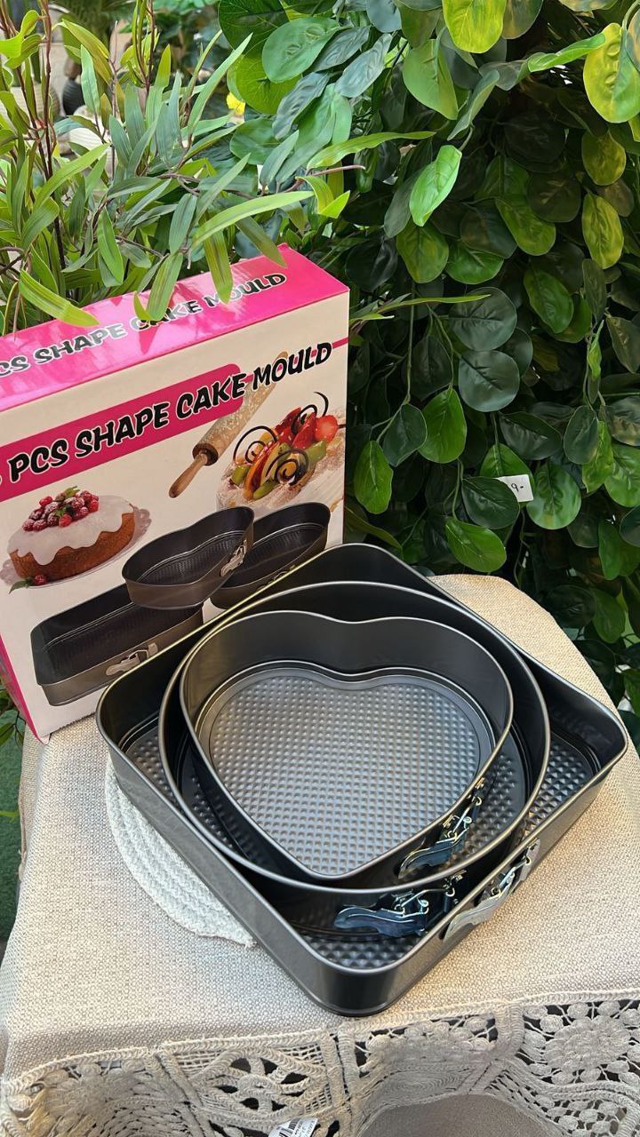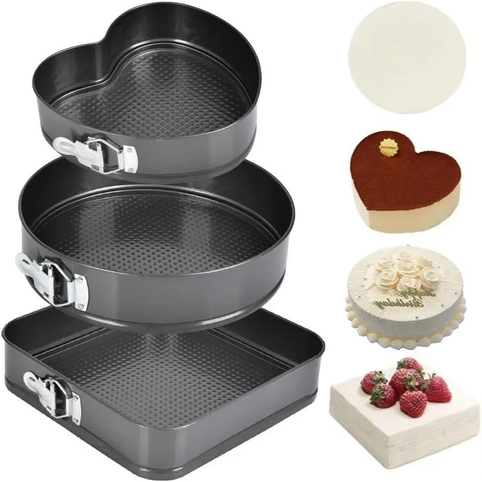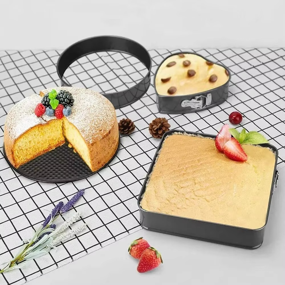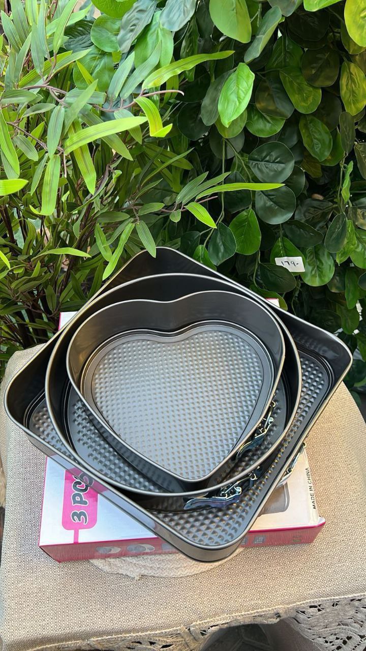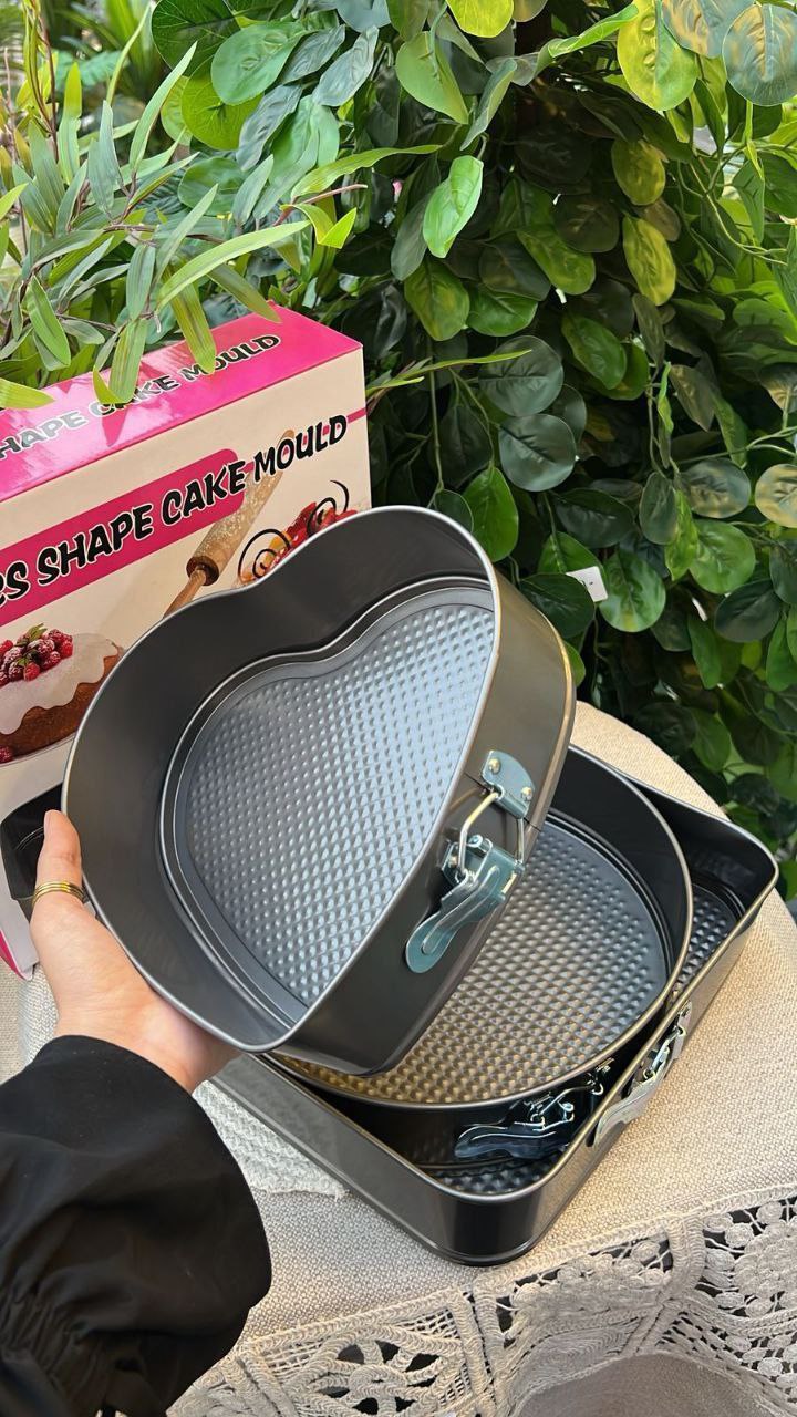 طقم قوالب كيك عملي جداً ومثالي لعمل التورتات والتشيز كيك. الطقم 3 قطع بأشكال مختلفة (دائرة، قلب، ومربع)، وكل قالب قابل للفك من الجنب، وده بيخليكي تطلعي الكيكة أو التشيز كيك بسهولة ومن غير ما تبوظ. الخامة استالس قوية ومناسبة للفرن.