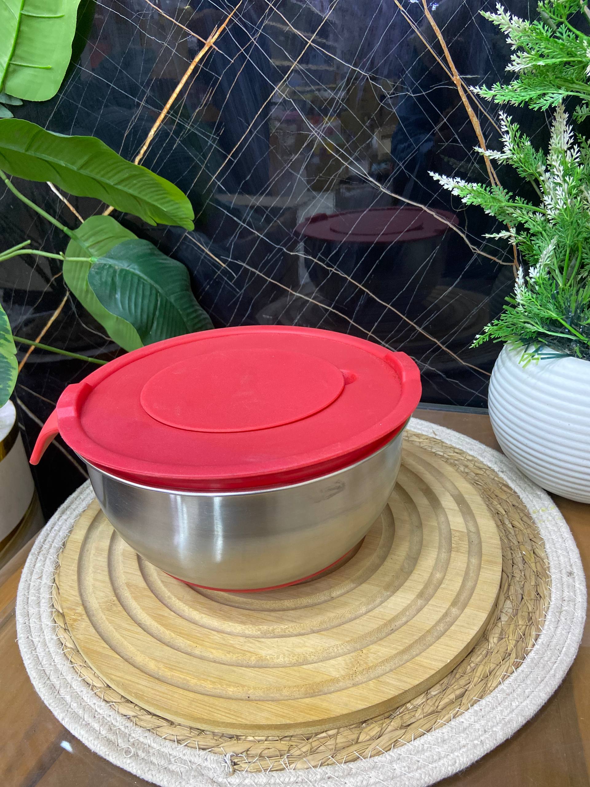 بنقدم لك بولة الخلط والعجن المصنوعة من الاستانلس ستيل القوي المقاوم للصدأ، والمزودة بغطاء سيليكون عبقري بيقفل بإحكام تام. البولة دي هي جوكر مطبخك؛ هتستخدميها في العجن والتحضير، وبمجرد ما تخلصي تقدري تغطيها وتدخليها الثلاجة وتضمن برضه إن أكلك يفضل طازج وصحي.
